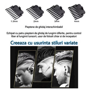 Include accesorii utile pentru diferite lungimi de taiere: 4 distantiere (1.5 mm / 2 mm / 3 mm / 4 mm), perie de curatare, ulei pentru intretinere si cablu USB pentru incarcare rapida (2 ore pentru incarcare completa).
