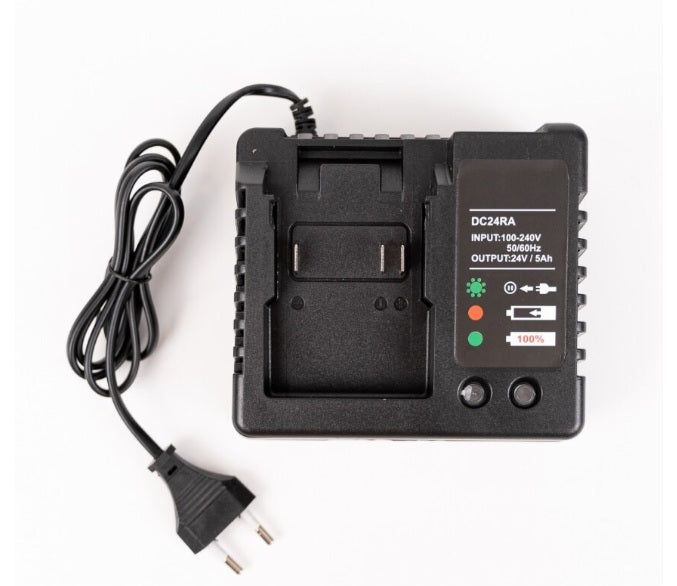 Kit-ul include doua acumulatori Li-Ion 48V 5Ah, care ofera puterea necesara pentru terminarea lucrului, statie de incarcare, maner suplimentar, cheie de strangere si protectie disc.