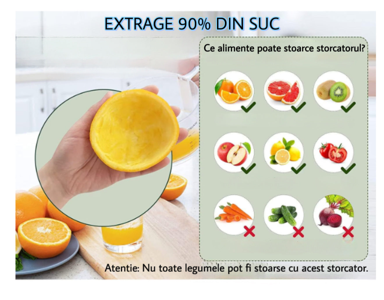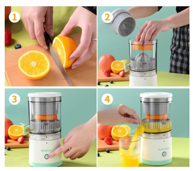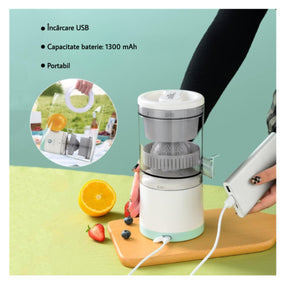 Storcator portabil de fructe, reincarcabil prin USB, fara fir, ideal pentru acasa sau in aer liber. Sistem de macinare in spirala pentru randament maxim de suc cu pierderi minime. Se incarca complet in 2 ore si poate stoarce 2.5-3 kg de fructe. Nu se recomanda utilizarea continua si nu se foloseste in timpul incarcarii. Perfect pentru picnic, plaja, petreceri sau gratare.