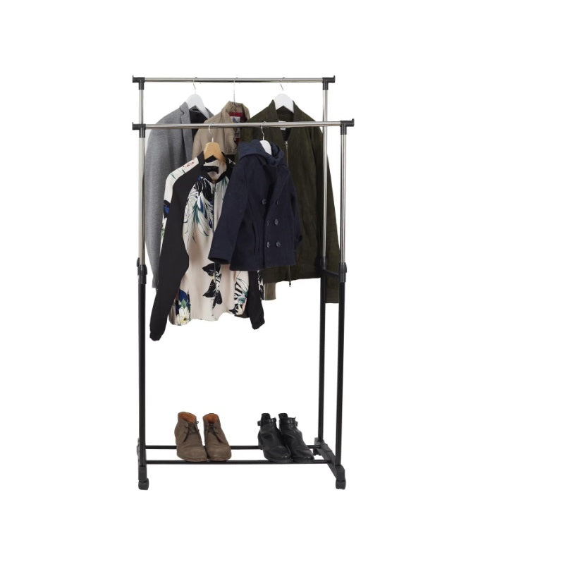 Suportul dublu pentru haine cu spatiu pentru pantofi este solutia ideala pentru pastrarea ordinii in dormitor, dressing sau magazin. Fabricat din fier si metal rezistent, acesta ofera un spatiu generos pentru rochii, fuste, paltoane, tricouri, pantaloni sau costume, precum si compartimente pentru depozitarea incaltamintei.